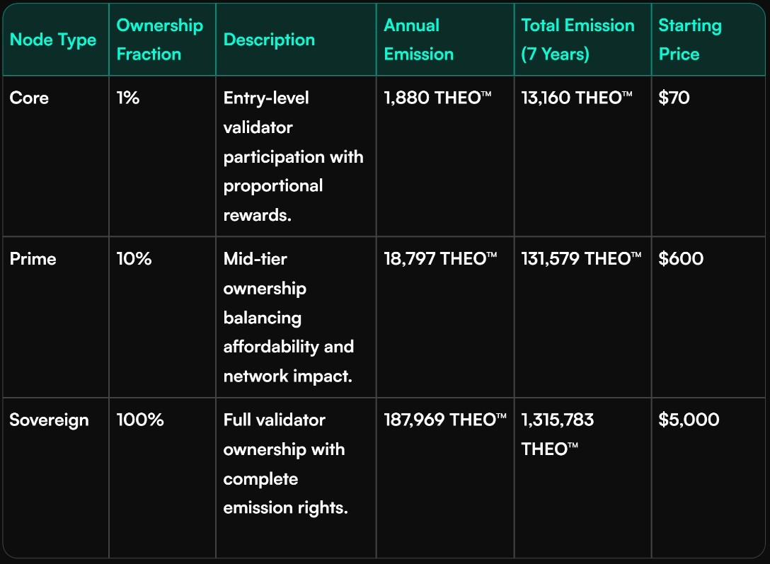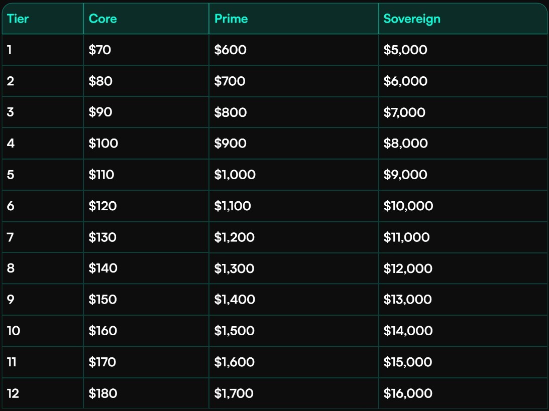 Each node type progresses through 12 pricing tiers. As earlier tiers sell out, the system automatically advances to the next, increasing price and reinforcing scarcity. This model creates both urgency and fairness — rewarding early adopters while maintaining transparent progression through the sale.